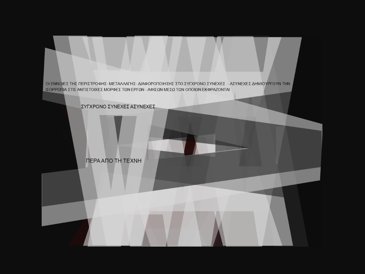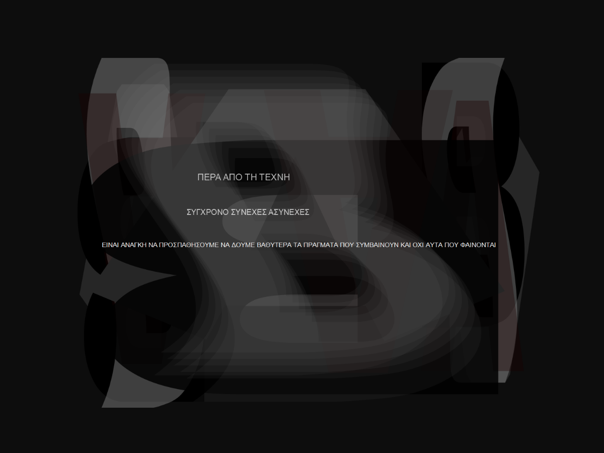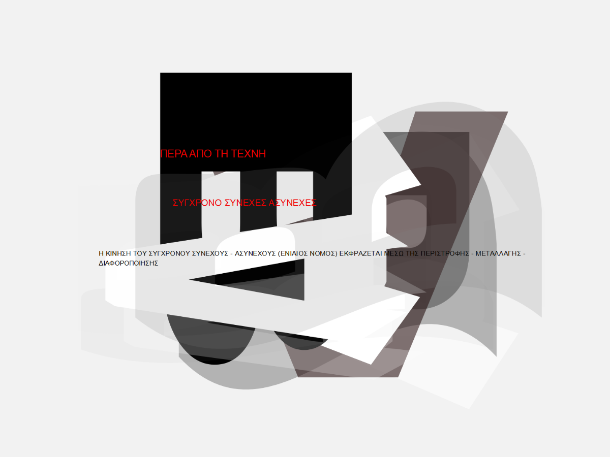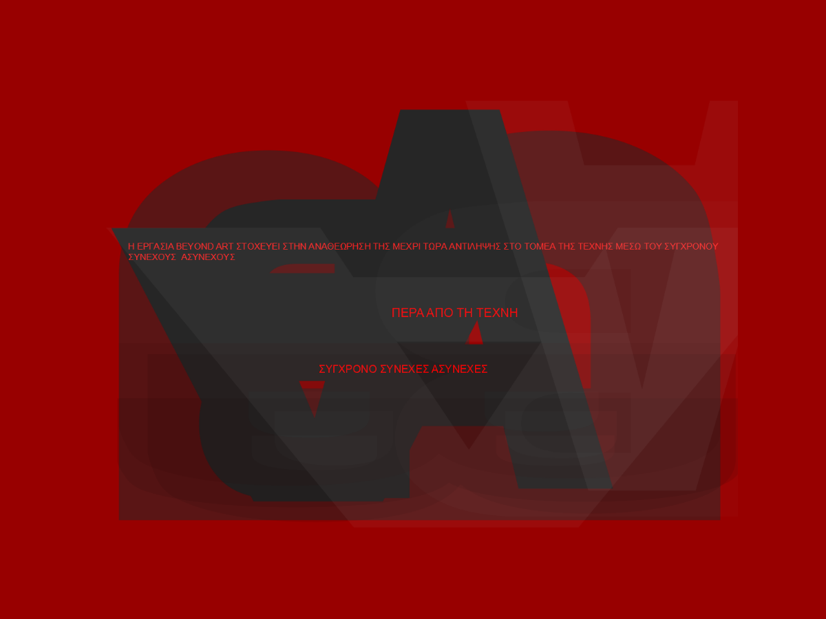 Η ερευνητική εργασία beyond – art στοχεύει στην αναθεώρηση της μέχρι τώρα αντίληψης στη τέχνη, μέσω του σύγχρονου συνεχούς – ασυνεχούς. Στόχος της είναι να παρουσιάσει το σύγχρονο συνεχές – ασυνεχές που είναι ενιαίος νόμος της φύσης και είναι δυνατόν να αποκωδικοποιηθεί σε συμβολικές μορφικές παραστάσεις, μέσω του δυαδικού συστήματος της συνέχειας και ασυνέχειας οι οποίες υφίστανται στη φύση συγχρόνως.