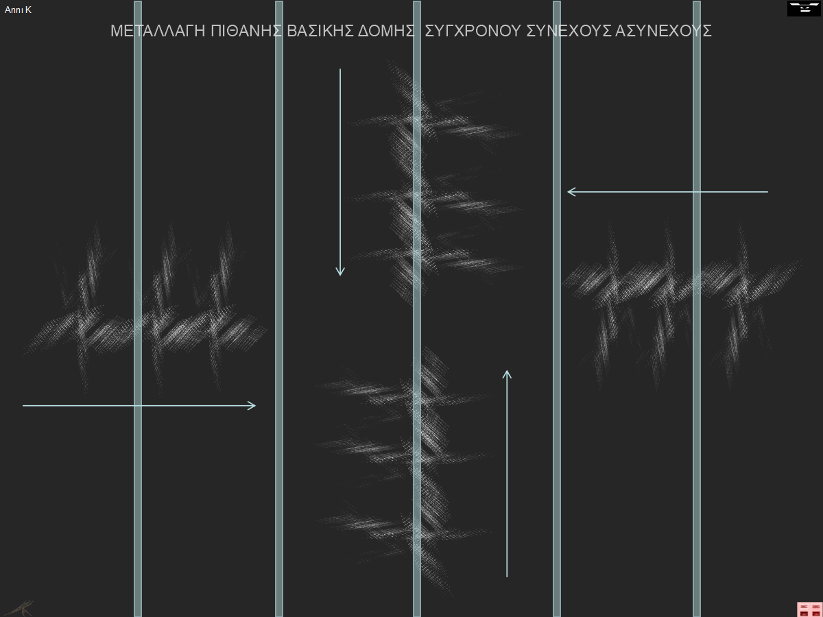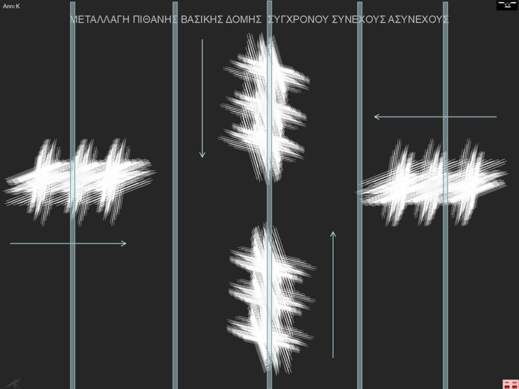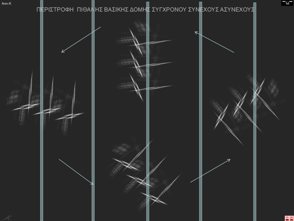 Το σύγχρονο συνεχές – ασυνεχές είναι κίνηση πιθανών βασικών δομών, η οποία διέπεται από τις ιδιότητες της περιστροφής, μεταλλαγής, διαφοροποίησης. Η κίνηση των βασικών δομών παράγει καλλιτεχνικές μορφές ως αποτέλεσμα του νόμου του σύγχρονου συνεχούς – ασυνεχούς. Η κίνηση μιας εκάστοτε πιθανής βασικής δομής (βάσει των ιδιοτήτων της περιστροφής, μεταλλαγής, διαφοροποίησης) είναι συνεχόμενη και διακοπτόμενη ΣΥΓΧΡΟΝΩΣ και εκφράζει μια ενοποιημένη πραγματικότητα η οποία υφίσταται στη φύση.