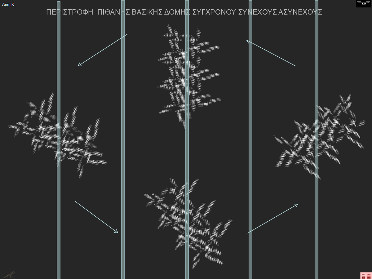 Οι μορφικές παραστάσεις των ουσιωδών εννοιών της φύσης είναι οι συμβολικές εκφράσεις των μεταβαλλόμενων πιθανοτήτων της εκάστοτε βασικής δομής. Η ενέργεια στη φύση είναι διασπασμένη και ενοποιημένη ΣΥΓΧΡΟΝΩΣ. Οι συνθέσεις ως αποκωδικοποιημένα μορφικά σύμβολα εκφράζουν το σύγχρονο συνεχές – ασυνεχές και αποτυπώνουν τη συνεχόμενη και διακοπτόμενη κίνηση του στο ενεργειακό πεδίο.